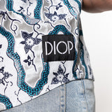 For a classic color combination that will bring any outfit together, this navy and silver pattern is equally easy to wear and style. Though it looks complicated from a distance, the closer you get, the cleaner it is. The design is composed of a quiet floral lending a fresh, modern look to a classic motif.