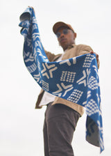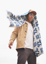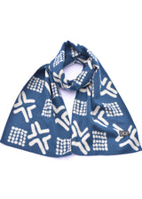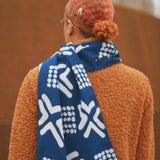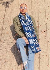 This scarf features a very popular pattern inspired by Bogolanfini (or mud cloth), a handmade Malian cotton fabric dyed with fermented mud that dates back to the 12th century. Though traditionally rendered in white on black, our navy blue colorway is a neat, clean alternative that would be at home in any closet.